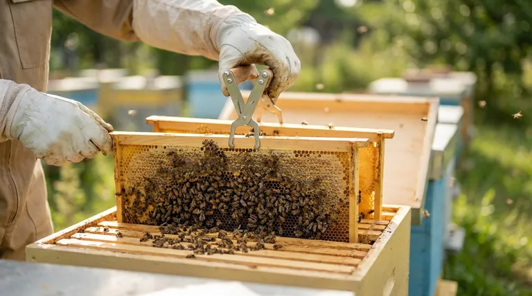 - 수직 들어 올림: 인접한 프레임 사이에 벌을 으깨는 "굴림" 동작을 최소화합니다.